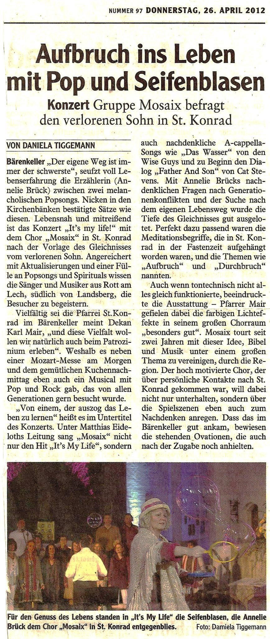 Bericht zum Konzert "It`s my Life" in Augsburg/Bärenkeller am 22. April 2012 - Augsburger Allgemeine (26. April 2012)